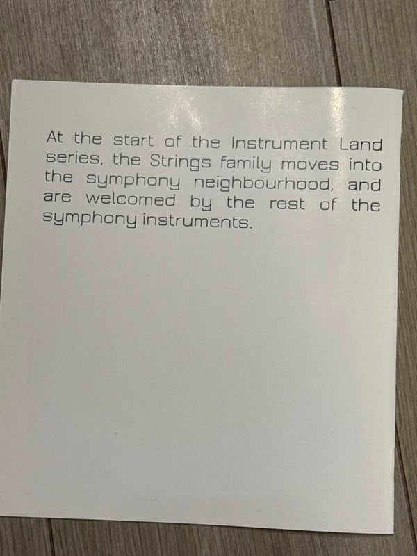At the start of the Instrument Land series, the Strings family moves into the symphony neighbourhood, and are welcomed by the rest of the symphony instruments.
